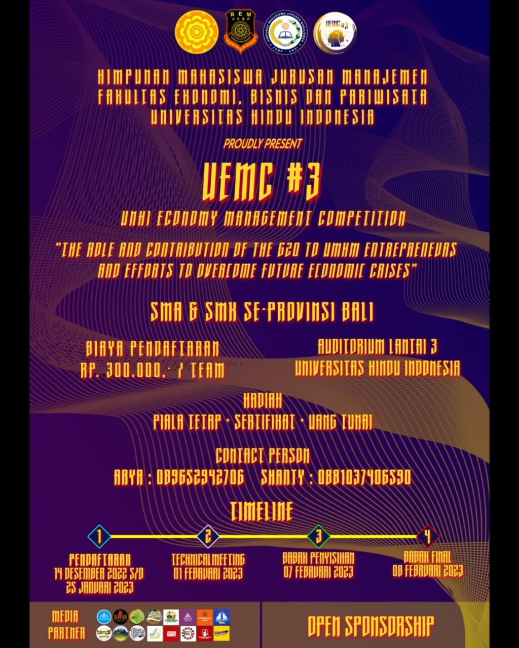 Kami hadir kembali dan mengajak seluruh siswa siswi SMA/SMK se-Provinsi Bali untuk menyalurkan bakat, wawasan serta argumen kalian dalam UEMC#3 [UNHI Economy Management Competition] 🔥‼️