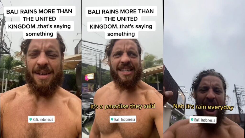 Seorang bule atau wisman bernama akun Bobby Make Peace membagikan pengalamannya saat berada di Bali dan diterpa hujan, lewat video berdurasi kurang lebih 20 detik dia mengungkapkan beberapa kelecewaannya.