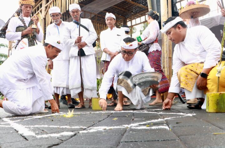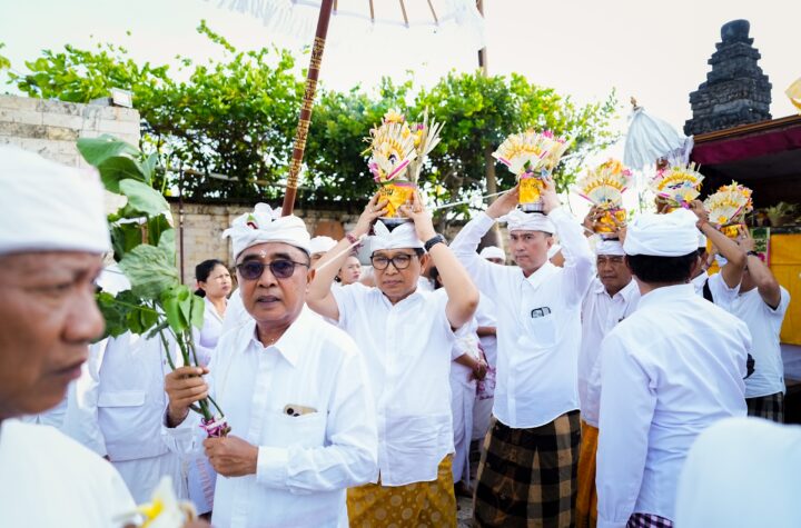 Bupati Badung, I Wayan Adi Arnawa, didampingi Ny. Rasniathi Adi Arnawa, menghadiri upacara Melaspas,...
