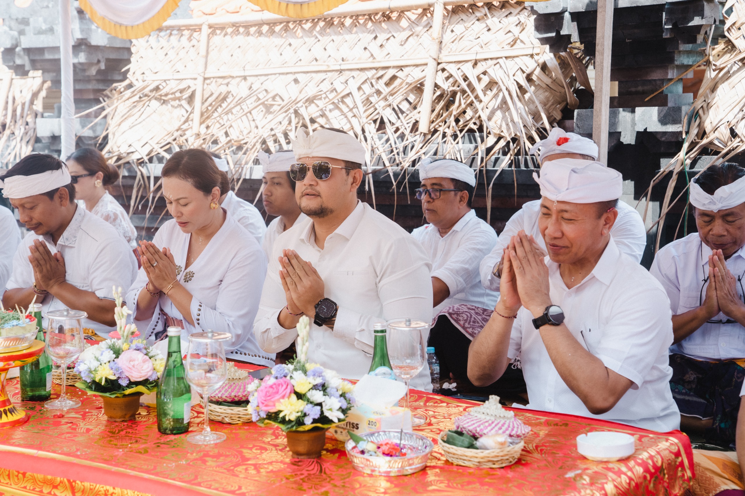 Wakil Bupati Badung, Bagus Alit Sucipta, didampingi Nyonya Yunita Alit Sucipta, menghadiri Puncak Karya Dewa Yadnya yang dirangkaikan dengan upacara mecaru, melaspas, dan mendem pedagingan di Pemerajan Ageng Pasek Gaduh, Kedonganan, Kuta, Badung, Rabu (22/04/2026).
