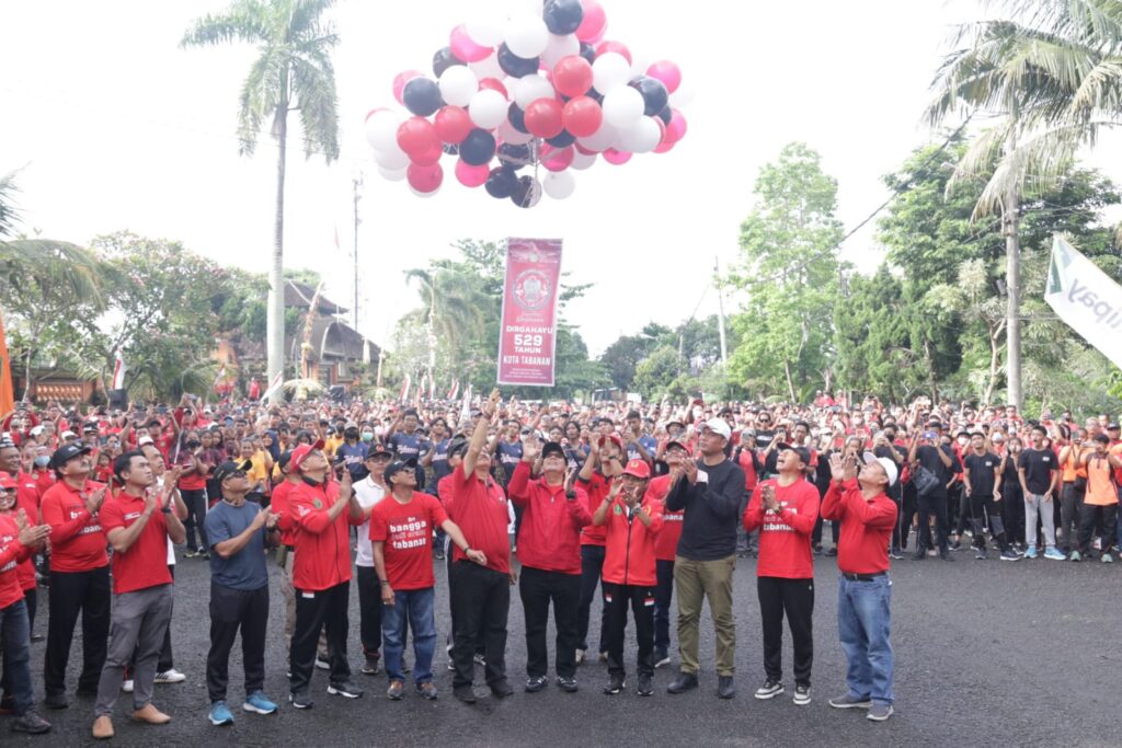 Sorak sorai ribuan Masyarakat Tabanan dalam seremonial menyambut Pembukaan Perayaan HUT Ke-529 Kota Tabanan yang dibuka oleh Bupati Tabanan, Dr. I Komang Gede Sanjaya, S.E.,M.M. sekaligus dirangkaikan dengan Pelepasan Kontingen Atlet Porprov Bali Kabupaten Tabanan Tahun 2022 dan Pencanangan Car Free Day serta Penyerahan Hadiah Utama Gebyar PBB di Kabupaten Tabanan, Minggu (6/11).
