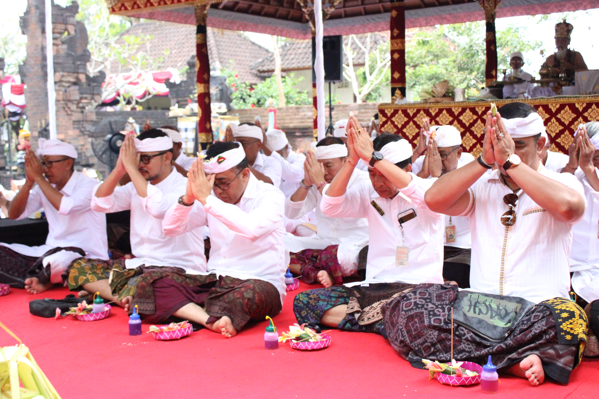 Walikota Denpasar, IGN Jaya Negara melaksanakan mendem pedagingan dan pemelaspasan mengingat telah rampungnya renovasi Bale Piyasan di Pura Dalem Gunung Sari dan Pura Desa Adat Penyaringan Sanur, Senin (27/3).