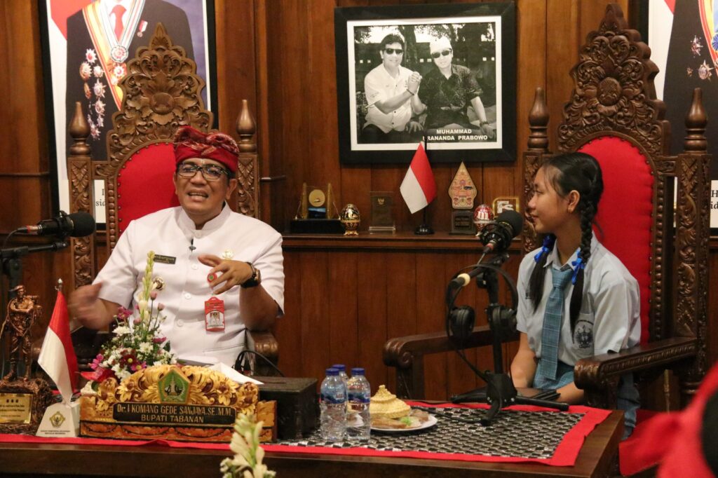 Kreatifitas dan semangat generasi muda Tabanan dalam inovasi digital di dunia pendidikan kini patut diacungi jempol. Hal ini tentunya mendapat apresiasi dan dukungan yang mengalir deras dari Pemerintah Kabupaten Tabanan. Bercerita mengenai profil Bupati dan filosofi Kabupaten Tabanan, Dr. I Komang Gede Sanjaya.,S.E.,M.M selaku Kepala Daerah bergabung dalam bincang hangat melalui siaran “Podcast Kopi” milik siswa siswi Osis Spenta SMP Negeri 1 Tabanan yang dilakukan di Ruang Kerja Kantor Bupati Tabanan, Rabu (24/5).