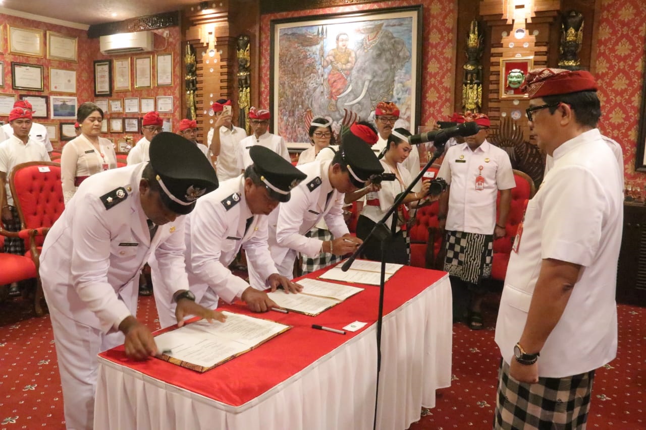 Demi meningkatkan sinergitas dalam pembangunan Tabanan Era Baru yang dimulai dari Desa, Bupati Tabanan, Dr. I Komang Gede Sanjaya.,S.E.,M.M, Hadiri Acara Pengambilan Sumpah Jabatan dan Pelantikan Perbekel Antar Waktu (PAW) Masa Bhakti 2023-2025 Desa Antosari, Selemadeg Barat, Desa Sembung Gede, Kerambitan dan Desa Pandak Gede, Kediri, Tabanan yang berlangsung di Ruang Rapat Bupati Tabanan, Rabu (27/12).